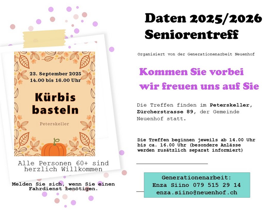 Die Treffen finden im Peterskeller, Zürcherstrasse 89, der Gemeinde Neuenhof statt.